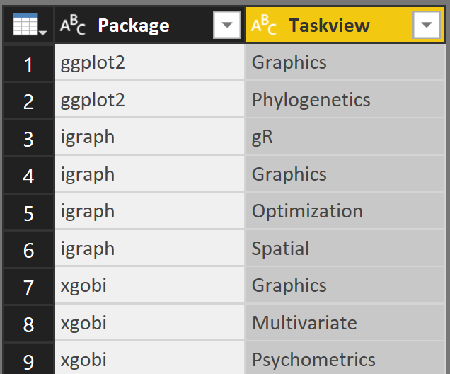 Create a new table by referencing the table packagetaskview, remove the package column and finally I remove duplicate rows.