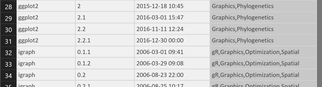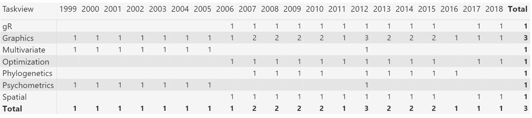 These tables allow to extract information like number of releases and to identify the packages that can be used to answer analytical questions for a specific topic - the Task View. Please be aware that there are packages that are not assigned to a Task View, but are also able to help to answer these questions. So please understand the Task View as a first hint and not as finite list.
