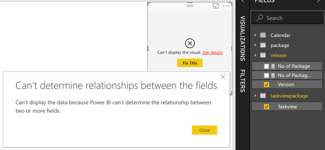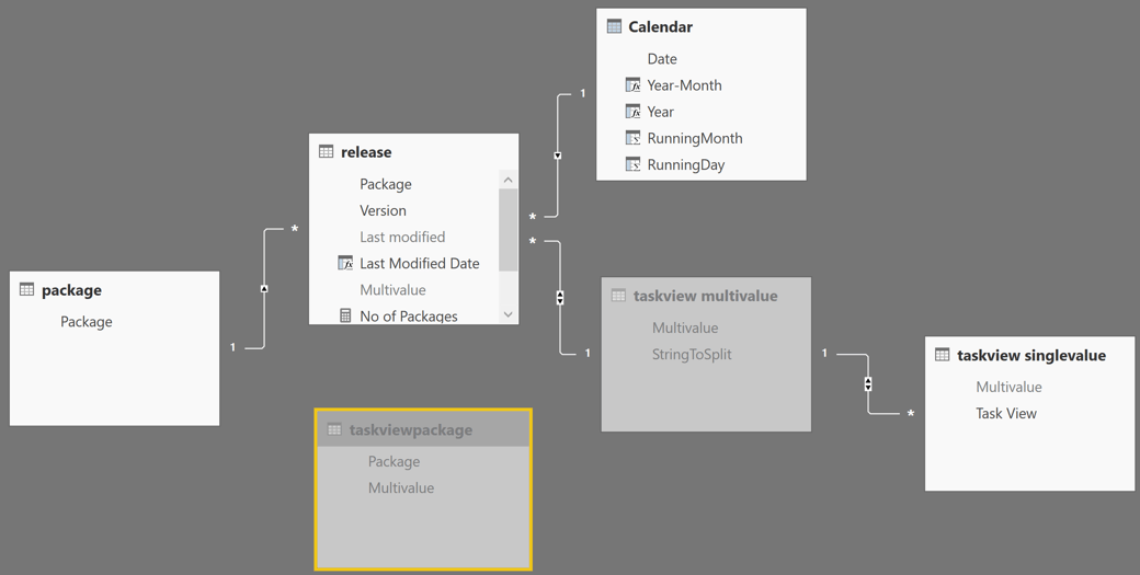 If I want to know how many packages have been assigned to a Task View over time (maybe to get a first impression what's a trend in analytics), I have to combine the tables release and taskviewpackage, but unfortunately I get the following dreaded Error Message: "Can't determine relationships between the fields."