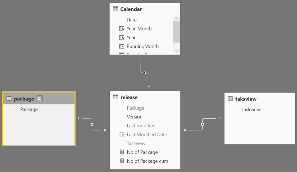 There is one dimension table (package) and two fact tables (release and taskviewpackage). The table package basically contains some information about the package, like the name, the author(s) of the package and similar information. I used some R code to scrape this information from the CRAN website.