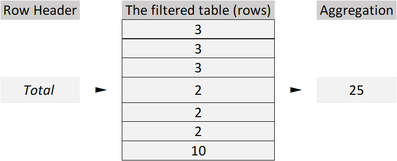 It’s imperative to understand that the same is happening for the total line, but as there is no row header present, meaning no filter exists, all the rows will be aggregated. This explains the Total value of 25 and also the Average value of ~3.57 (25 / 7), 7 is the number of rows that are considered, the filtered table. As there is no filter, this means all the rows. This is shown in the next picture: