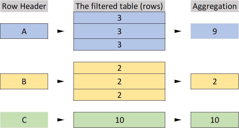 As already mentioned, a row header (the Company column) is an implicit filter. This means that all the rows of the table are filtered by this value and grouped by the aggregation function. Next to the filtering, it’s also necessary to remember that Power BI tries to group all rows by non-numeric columns (Company) and aggregate numeric columns. The following picture shows what is happening for each of the Companies: