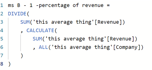 It divides the individual revenue (the 1st parameter of the DIVIDE function) by the revenue of all companies (the 2nd parameter of the DIVIDE function).