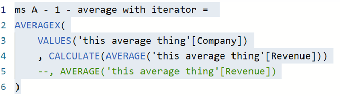 - As the 1st parameter of AVERAGEX is a table, each evaluation of the measure means an iteration across the table, so to avoid unexpected outcomes, it’s mandatory to always understand the size (especially the number of rows) of the iterated table. As VALUES(…) iterates across the filtered one-table column of …[Company] ( see universal truths – the filtered table). As the row header of the used column, creates an implicit filter, there is just one iteration for each Company A, B, C, and three iterations for the Total line.