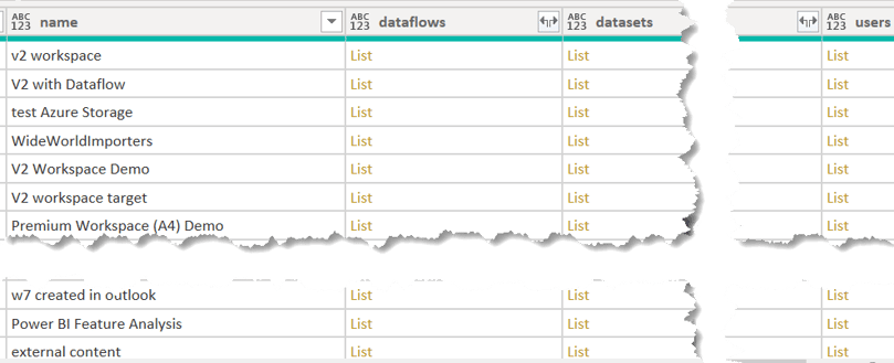 The next picture shows some columns of the JSON document, focusing on the dataflows, datasets, and users columns. As this content is a separate JSON document, this information materializes as a nested list in the query: