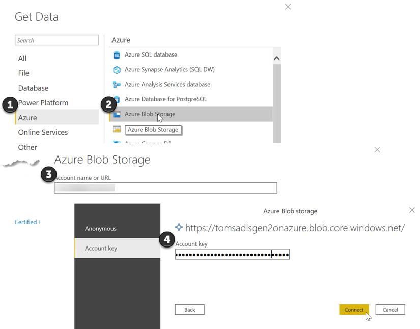 Storing the JSON document that contains the information of the Power BI service into the blob container requires the name of the storage account and a key for authentication purposes. The storage account and the key are also used to access the JSON document from Power BI Desktop to create the data model.