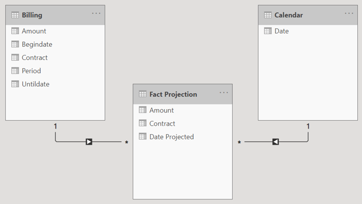 'Billing'[Contract} 1-->--* 'Fact Projections'[Contract]