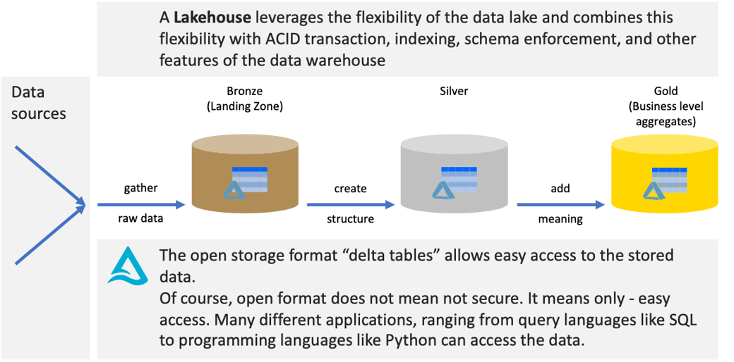 The image below visualizes the architectural approach of the lakehouse or the delta lakehouse: