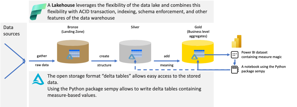 There is one thing about the Power BI dataset that still gets me excited: the definition of a DAX measure. If you are not familiar with DAX, a measure is calculating a value considering the current context of the user selection. This user selection, in combination with axis labels, row headers, and column headers, is the filter context. A measure automatically adapts to this filter context. If we are talking about tearing down walls, a measure is specific to a Power BI dataset. For this reason, someone can argue that a Power BI dataset represents a data silo even if each Business Intelligence tool that supports the open standard XMLA can connect to a Power BI dataset. If we look closer at the medallion architecture, a Power BI dataset in Microsoft Fabric can be built on top of delta tables inside the gold layer utilizing the new connection mode Direct Lake (https://learn.microsoft.com/en-us/power-bi/enterprise/directlake-overview). Still, values based on measures are unavailable to other tools accessing delta tables. This gap can be closed now 🙂