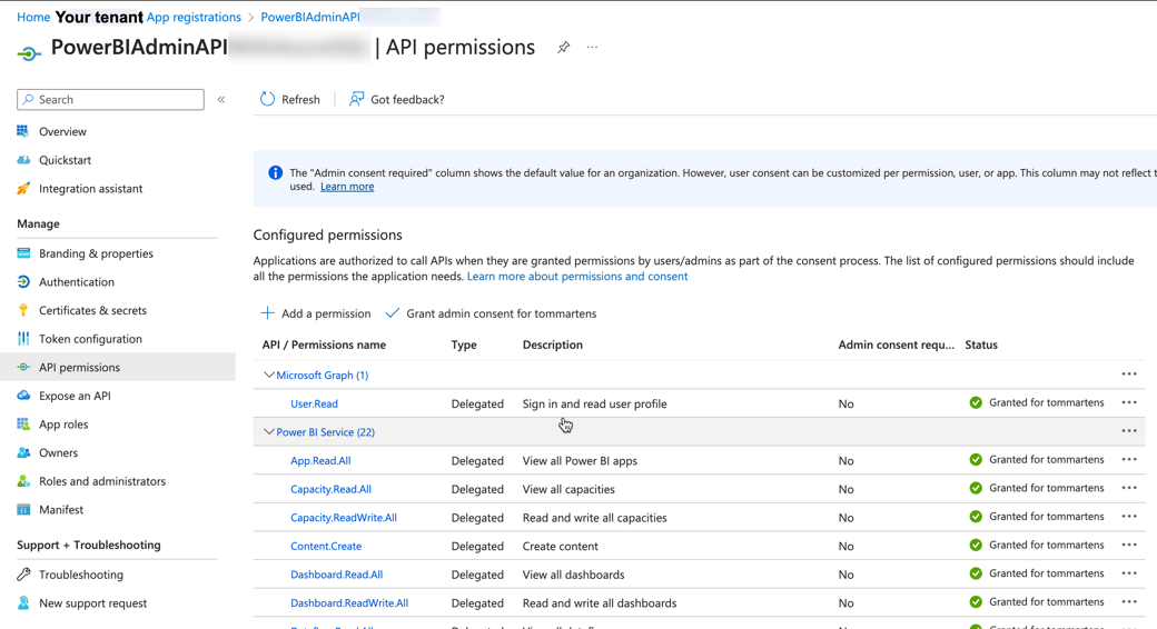 There are many Power BI REST APIs, but not all are required to succeed with a given task. For this reason, you can allow specific REST APIs to be executed by a service principal. This assignment is done in the API permissions blade of the service principal, this is shown in the following visualization: