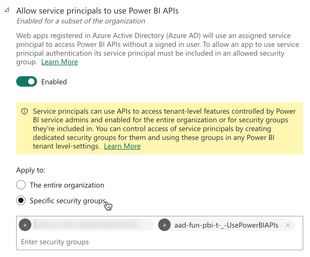 The following image shows how you allow the execution of Power BI REST APIs by the security group the Service Principal is assigned to: